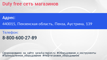 Duty free, сеть магазинов по адресу 440015, Пензенская область, Пенза, Аустрина, 139 в дальнейшем Организация, размещена в следующих категориях:
