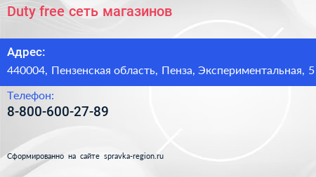 Duty free, сеть магазинов по адресу 440004, Пензенская область, Пенза, Экспериментальная, 5 в дальнейшем Организация, размещена в следующих категориях: