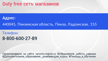 Duty free, сеть магазинов по адресу 440045, Пензенская область, Пенза, Ладожская, 155 в дальнейшем Организация, размещена в следующих категориях: