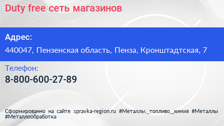 Duty free, сеть магазинов по адресу 440047, Пензенская область, Пенза, Кронштадтская, 7 в дальнейшем Организация, размещена в следующих категориях: