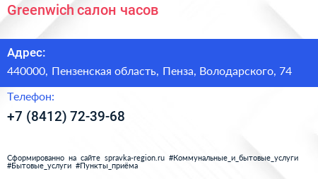 Greenwich, салон часов по адресу 440000, Пензенская область, Пенза, Володарского, 74 в дальнейшем Организация, размещена в следующих категориях: