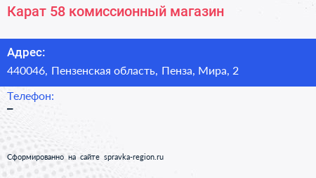 Карат 58, комиссионный магазин по адресу 440046, Пензенская область, Пенза, Мира, 2 в дальнейшем Организация, размещена в следующих категориях: