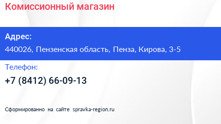 Комиссионный магазин по адресу 440026, Пензенская область, Пенза, Кирова, 3-5 в дальнейшем Организация, размещена в следующих категориях: