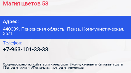 Магия цветов 58 по адресу 440039, Пензенская область, Пенза, Коммунистическая, 35/1 в дальнейшем Организация, размещена в следующих категориях: