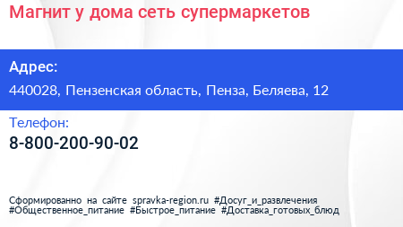 Магнит у дома, сеть супермаркетов по адресу 440028, Пензенская область, Пенза, Беляева, 12 в дальнейшем Организация, размещена в следующих категориях: