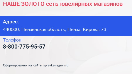 НАШЕ ЗОЛОТО, сеть ювелирных магазинов по адресу 440000, Пензенская область, Пенза, Кирова, 73 в дальнейшем Организация, размещена в следующих категориях: