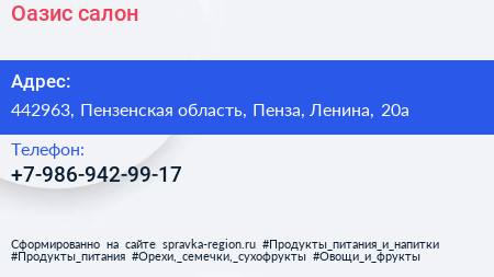 Оазис, салон по адресу 442963, Пензенская область, Пенза, Ленина, 20а в дальнейшем Организация, размещена в следующих категориях: