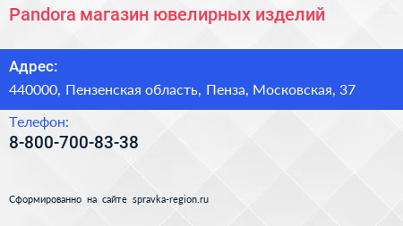 Pandora, магазин ювелирных изделий по адресу 440000, Пензенская область, Пенза, Московская, 37 в дальнейшем Организация, размещена в следующих категориях: