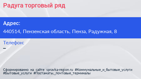 Радуга, торговый ряд по адресу 440514, Пензенская область, Пенза, Радужная, 8 в дальнейшем Организация, размещена в следующих категориях: