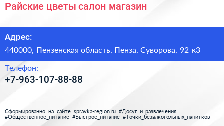 Райские цветы, салон-магазин по адресу 440000, Пензенская область, Пенза, Суворова, 92 к3 в дальнейшем Организация, размещена в следующих категориях: