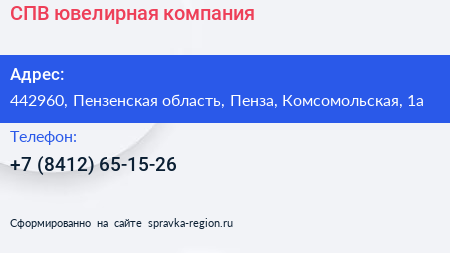 СПВ, ювелирная компания по адресу 442960, Пензенская область, Пенза, Комсомольская, 1а в дальнейшем Организация, размещена в следующих категориях:
