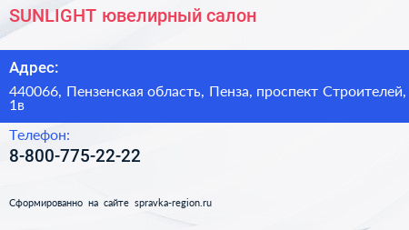SUNLIGHT, ювелирный салон по адресу 440066, Пензенская область, Пенза, проспект Строителей, 1в в дальнейшем Организация, размещена в следующих категориях: