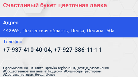 Счастливый букет, цветочная лавка по адресу 442965, Пензенская область, Пенза, Ленина, 60а в дальнейшем Организация, размещена в следующих категориях: