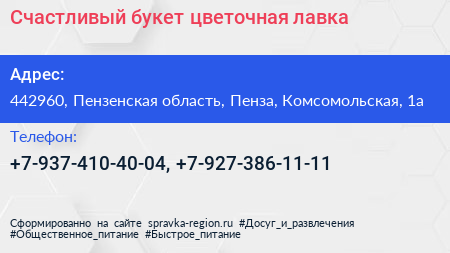Счастливый букет, цветочная лавка по адресу 442960, Пензенская область, Пенза, Комсомольская, 1а в дальнейшем Организация, размещена в следующих категориях: