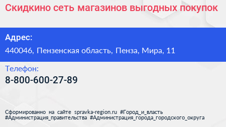 Скидкино, сеть магазинов выгодных покупок по адресу 440046, Пензенская область, Пенза, Мира, 11 в дальнейшем Организация, размещена в следующих категориях: