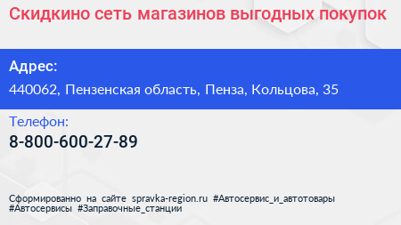 Скидкино, сеть магазинов выгодных покупок по адресу 440062, Пензенская область, Пенза, Кольцова, 35 в дальнейшем Организация, размещена в следующих категориях: