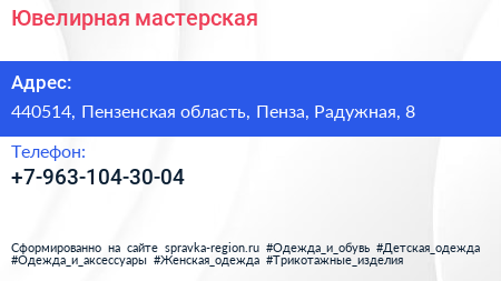 Ювелирная мастерская по адресу 440514, Пензенская область, Пенза, Радужная, 8 в дальнейшем Организация, размещена в следующих категориях: