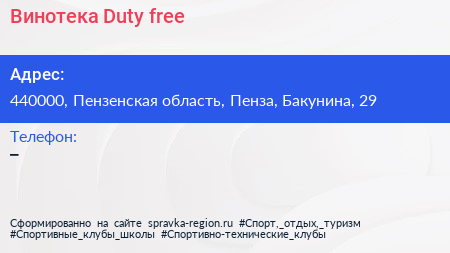 Винотека Duty free по адресу 440000, Пензенская область, Пенза, Бакунина, 29 в дальнейшем Организация, размещена в следующих категориях: