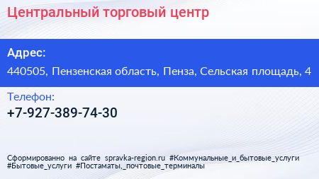 Центральный, торговый центр по адресу 440505, Пензенская область, Пенза, Сельская площадь, 4 в дальнейшем Организация, размещена в следующих категориях: