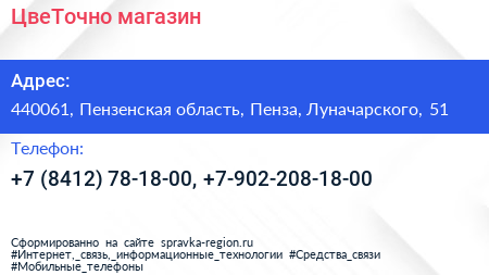 ЦвеТочно, магазин по адресу 440061, Пензенская область, Пенза, Луначарского, 51 в дальнейшем Организация, размещена в следующих категориях: