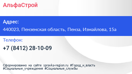 АльфаСтрой по адресу 440023, Пензенская область, Пенза, Измайлова, 15а в дальнейшем Организация, размещена в следующих категориях: