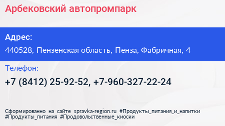 Арбековский, автопромпарк по адресу 440528, Пензенская область, Пенза, Фабричная, 4 в дальнейшем Организация, размещена в следующих категориях:
