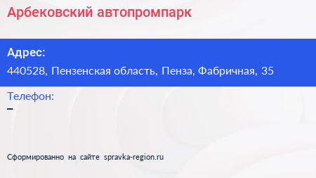 Арбековский, автопромпарк по адресу 440528, Пензенская область, Пенза, Фабричная, 35 в дальнейшем Организация, размещена в следующих категориях: