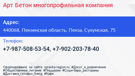 Арт Бетон, многопрофильная компания по адресу 440068, Пензенская область, Пенза, Сухумская, 75 в дальнейшем Организация, размещена в следующих категориях: