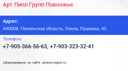 Арт Пипл Групп-Поволжье по адресу 440008, Пензенская область, Пенза, Пушкина, 45 в дальнейшем Организация, размещена в следующих категориях: