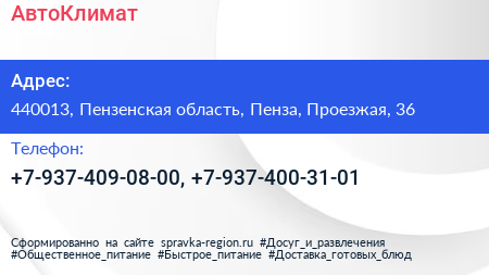 АвтоКлимат по адресу 440013, Пензенская область, Пенза, Проезжая, 36 в дальнейшем Организация, размещена в следующих категориях: