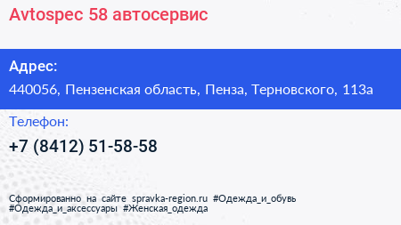 Avtospec 58, автосервис по адресу 440056, Пензенская область, Пенза, Терновского, 113а в дальнейшем Организация, размещена в следующих категориях: