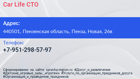 Car Life, СТО по адресу 440501, Пензенская область, Пенза, Новая, 26в в дальнейшем Организация, размещена в следующих категориях: