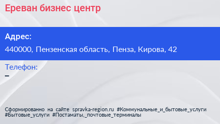 Ереван, бизнес-центр по адресу 440000, Пензенская область, Пенза, Кирова, 42 в дальнейшем Организация, размещена в следующих категориях: