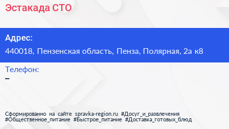 Эстакада, СТО по адресу 440018, Пензенская область, Пенза, Полярная, 2а к8 в дальнейшем Организация, размещена в следующих категориях: