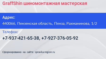GraffShin, шиномонтажная мастерская по адресу 440066, Пензенская область, Пенза, Рахманинова, 1/2 в дальнейшем Организация, размещена в следующих категориях: