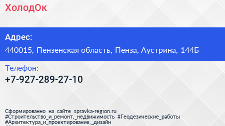 ХолодОк по адресу 440015, Пензенская область, Пенза, Аустрина, 144Б в дальнейшем Организация, размещена в следующих категориях: