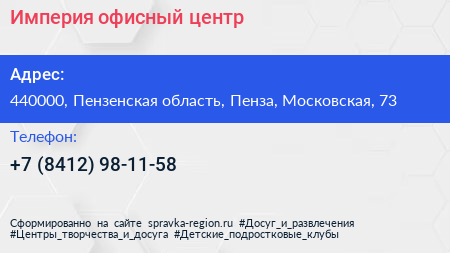 Империя, офисный центр по адресу 440000, Пензенская область, Пенза, Московская, 73 в дальнейшем Организация, размещена в следующих категориях: