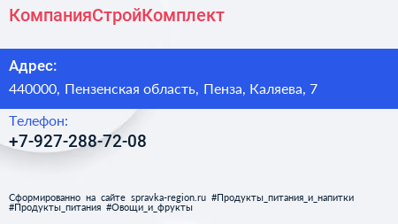 КомпанияСтройКомплект по адресу 440000, Пензенская область, Пенза, Каляева, 7 в дальнейшем Организация, размещена в следующих категориях:
