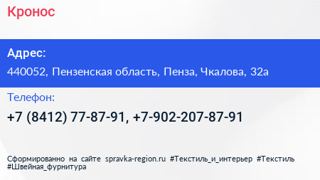 Кронос по адресу 440052, Пензенская область, Пенза, Чкалова, 32а в дальнейшем Организация, размещена в следующих категориях: