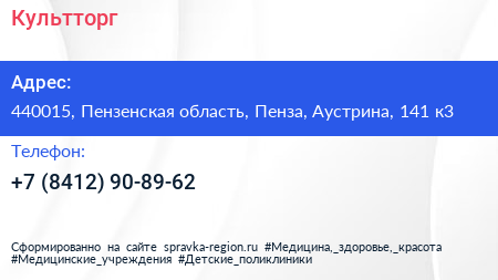 Культторг по адресу 440015, Пензенская область, Пенза, Аустрина, 141 к3 в дальнейшем Организация, размещена в следующих категориях: