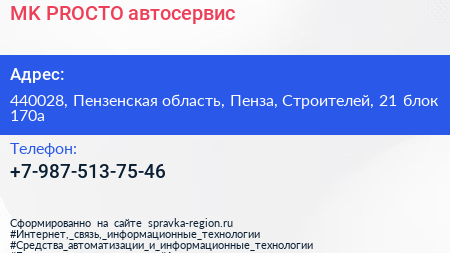 MK PROСТО, автосервис по адресу 440028, Пензенская область, Пенза, Строителей, 21 блок 170а в дальнейшем Организация, размещена в следующих категориях: