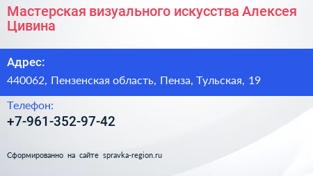 Мастерская визуального искусства Алексея Цивина по адресу 440062, Пензенская область, Пенза, Тульская, 19 в дальнейшем Организация, размещена в следующих категориях: