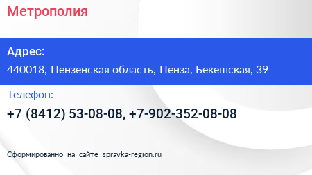 Метрополия по адресу 440018, Пензенская область, Пенза, Бекешская, 39 в дальнейшем Организация, размещена в следующих категориях: