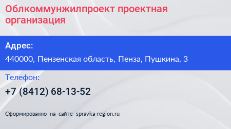 Облкоммунжилпроект, проектная организация по адресу 440000, Пензенская область, Пенза, Пушкина, 3 в дальнейшем Организация, размещена в следующих категориях: