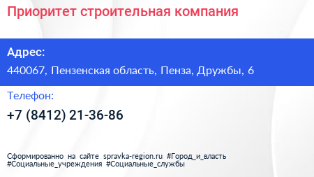 Приоритет, строительная компания по адресу 440067, Пензенская область, Пенза, Дружбы, 6 в дальнейшем Организация, размещена в следующих категориях: