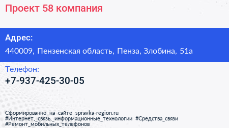 Проект 58, компания по адресу 440009, Пензенская область, Пенза, Злобина, 51а в дальнейшем Организация, размещена в следующих категориях: