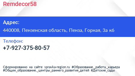 Remdecor58 по адресу 440008, Пензенская область, Пенза, Горная, 3а к6 в дальнейшем Организация, размещена в следующих категориях: