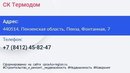 СК Термодом по адресу 440514, Пензенская область, Пенза, Фонтанная, 7 в дальнейшем Организация, размещена в следующих категориях: