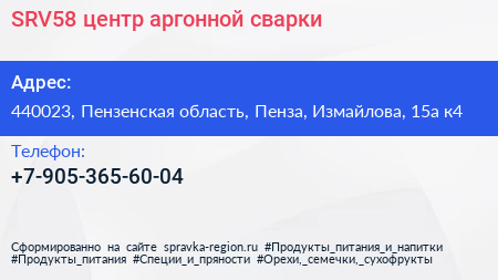 SRV58, центр аргонной сварки по адресу 440023, Пензенская область, Пенза, Измайлова, 15а к4 в дальнейшем Организация, размещена в следующих категориях: