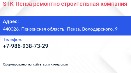 STK-Пенза, ремонтно-строительная компания по адресу 440026, Пензенская область, Пенза, Володарского, 9 в дальнейшем Организация, размещена в следующих категориях: